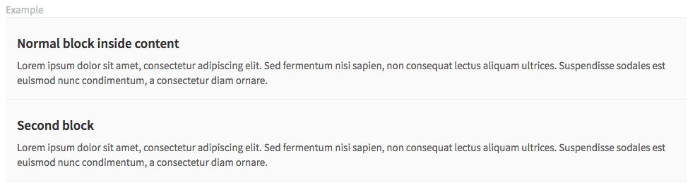 Content blocks (.content-block) are the basic grouping of content. They are commonly used in lists, and are separated by a botton border.